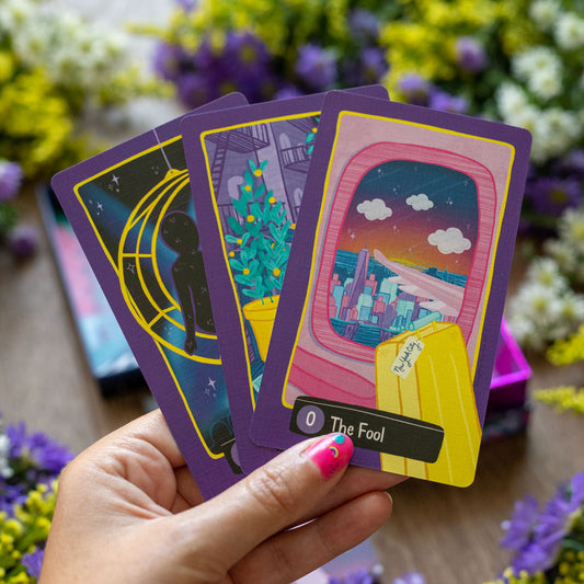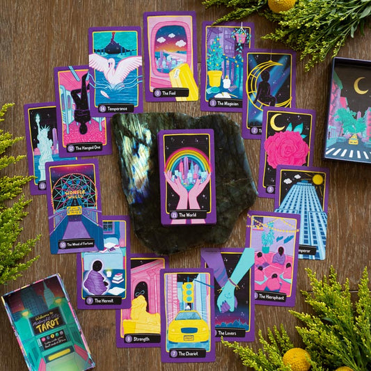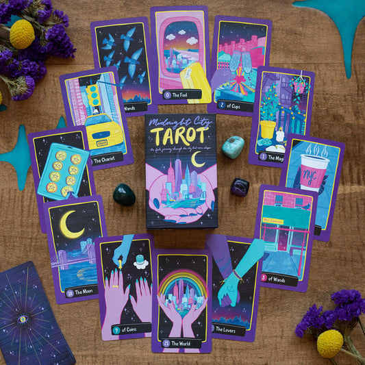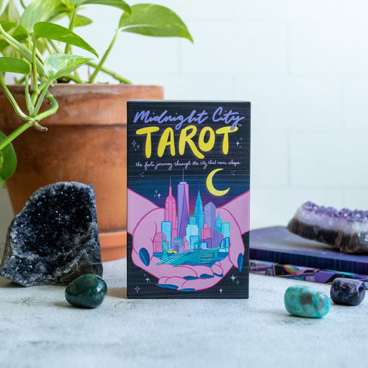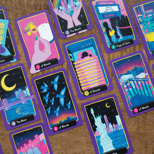 This unique and colorful tarot deck brings nostalgia and a portal to the dreamiest version of the city to the palm of your hands. Travel to Manhattan, Brooklyn and beyond whenever you pull a card from this magical deck. Midnight City Tarot was created for beginners and tarot professionals alike, with each card depicting a clear message tying back to the traditional interpretations of the tarot.